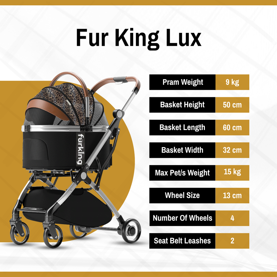 Elevate your pet’s outdoor experience with the Fur King Lux Pet Stroller (formally Bello Lux) —a perfect blend of comfort, style, and convenience for the modern pet owner. Designed with meticulous attention to detail, the Fur King Lux is more than just a stroller; it’s a lifestyle choice for those who believe in pampering their pets with the best.
